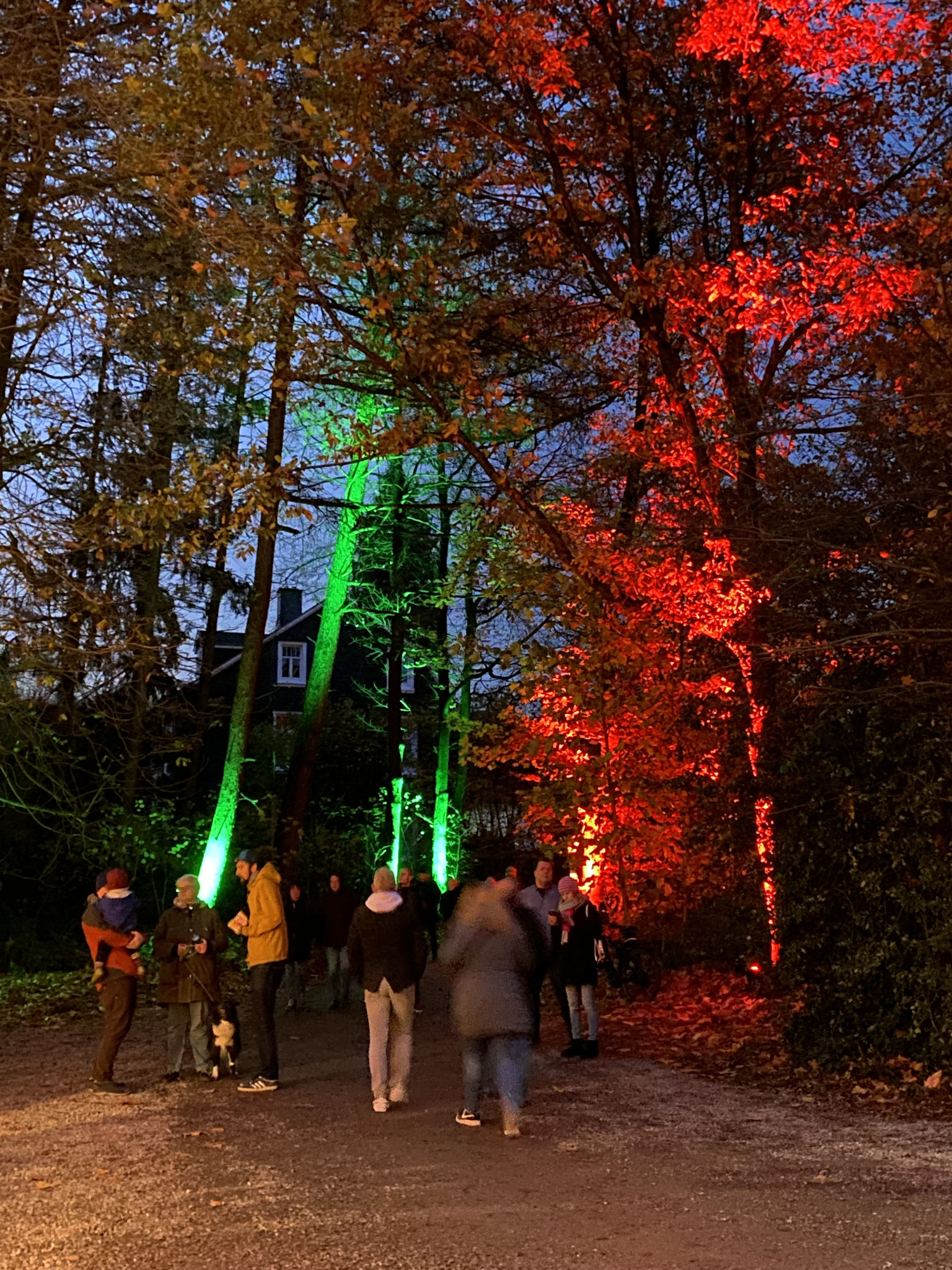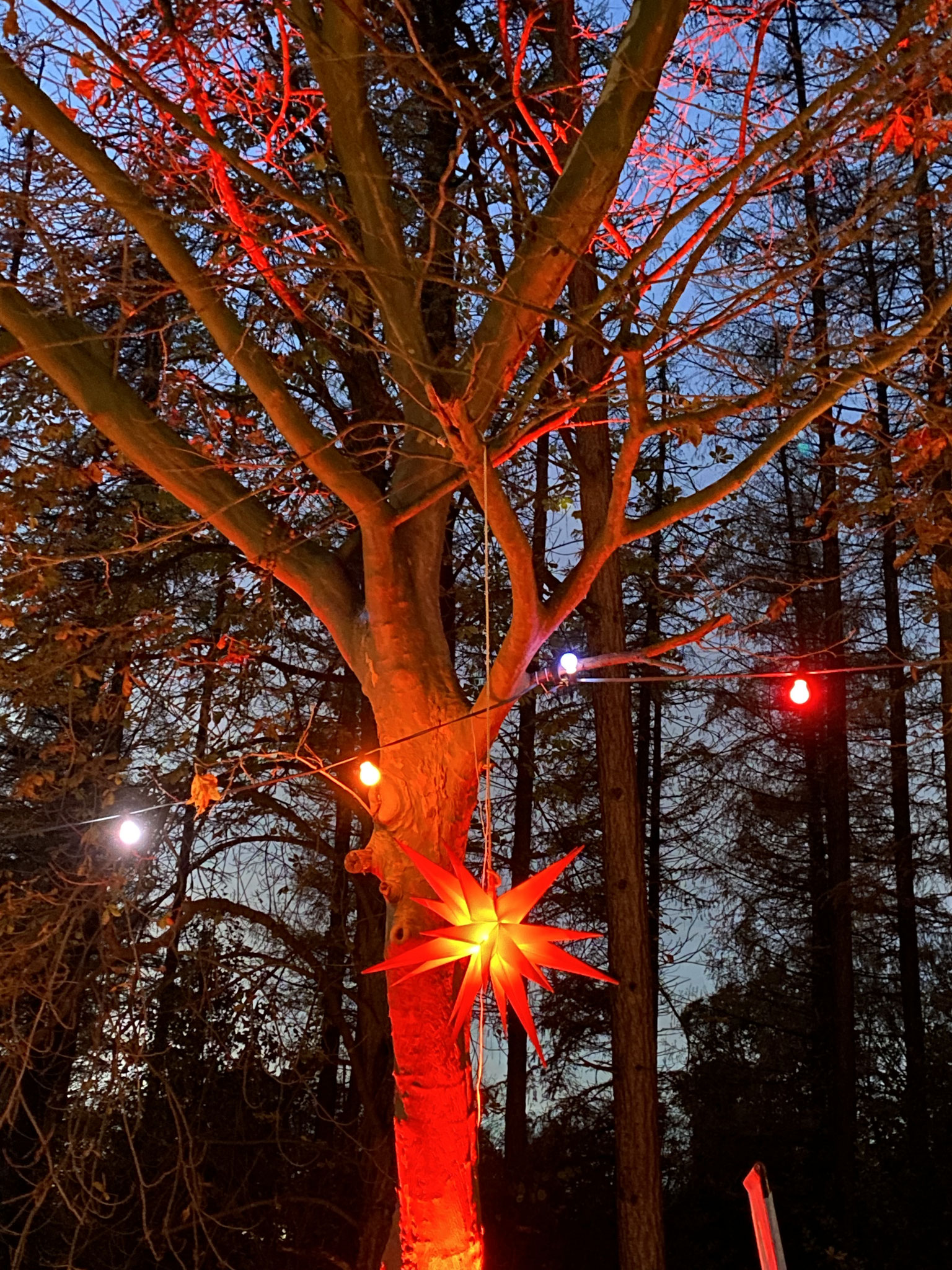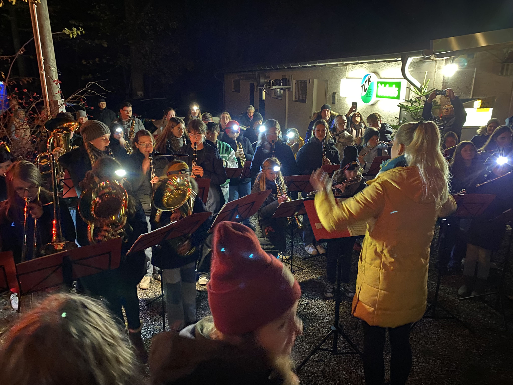 Die Technik AG vom CFG verwandelte den Wald mit einer Lichtinstallation und die Bläserklasse des FBR bot gegen 18.00 Uhr eine weihnachtliche musikalische Stimmung.